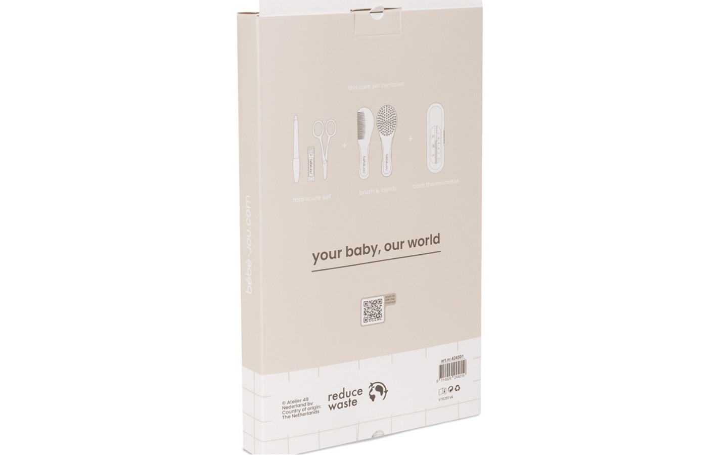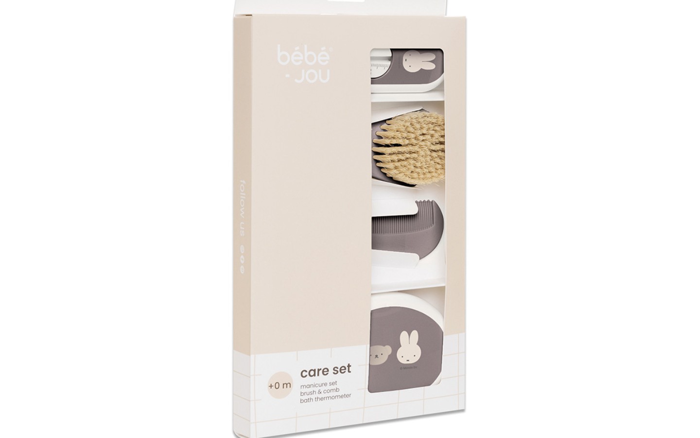 Een praktische verzorgingsset van bébé-jou om toekomstige ouders kado te geven. In deze set zit een kapset, manicureset en een badthermometer. Drie basisproducten die je nodig hebt voor een goede verzorging van je pasgeboren kindje.