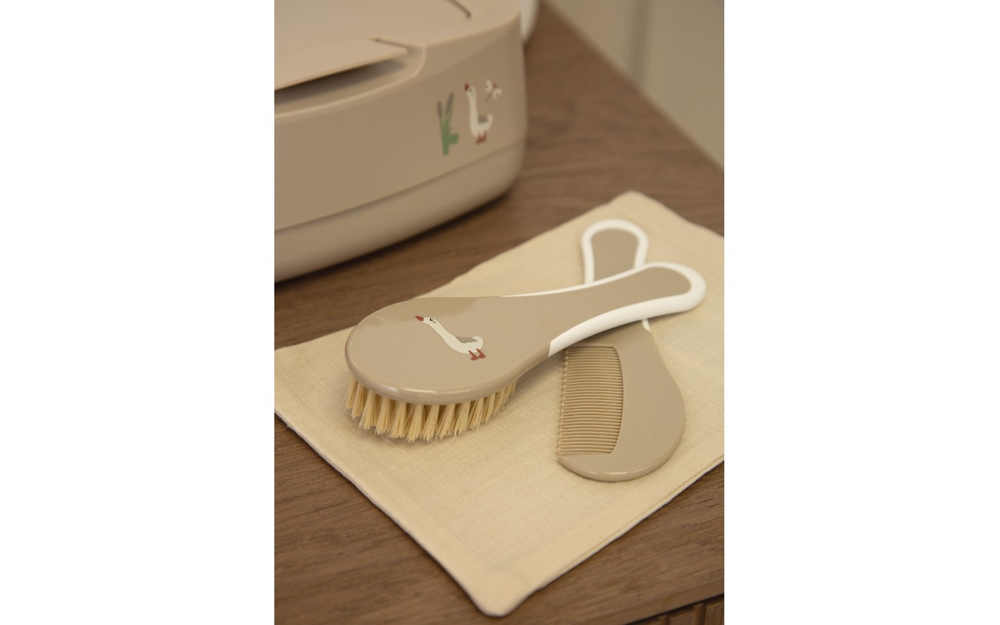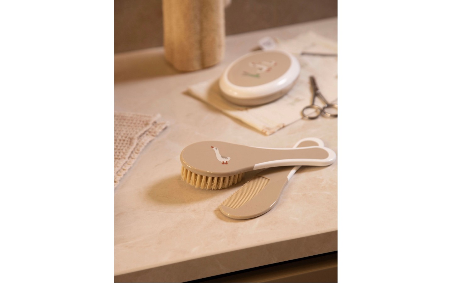 Met het kapsetje van bébé-jou breng je het kapsel van je kleintje eenvoudig in model. Het kammetje is ergonomisch vormgegeven en kan door de zachte bolletjes aan de uiteinden van de tandjes de hoofdhuid niet beschadigen. De borstel is gemaakt van nylon en heerlijk zacht.