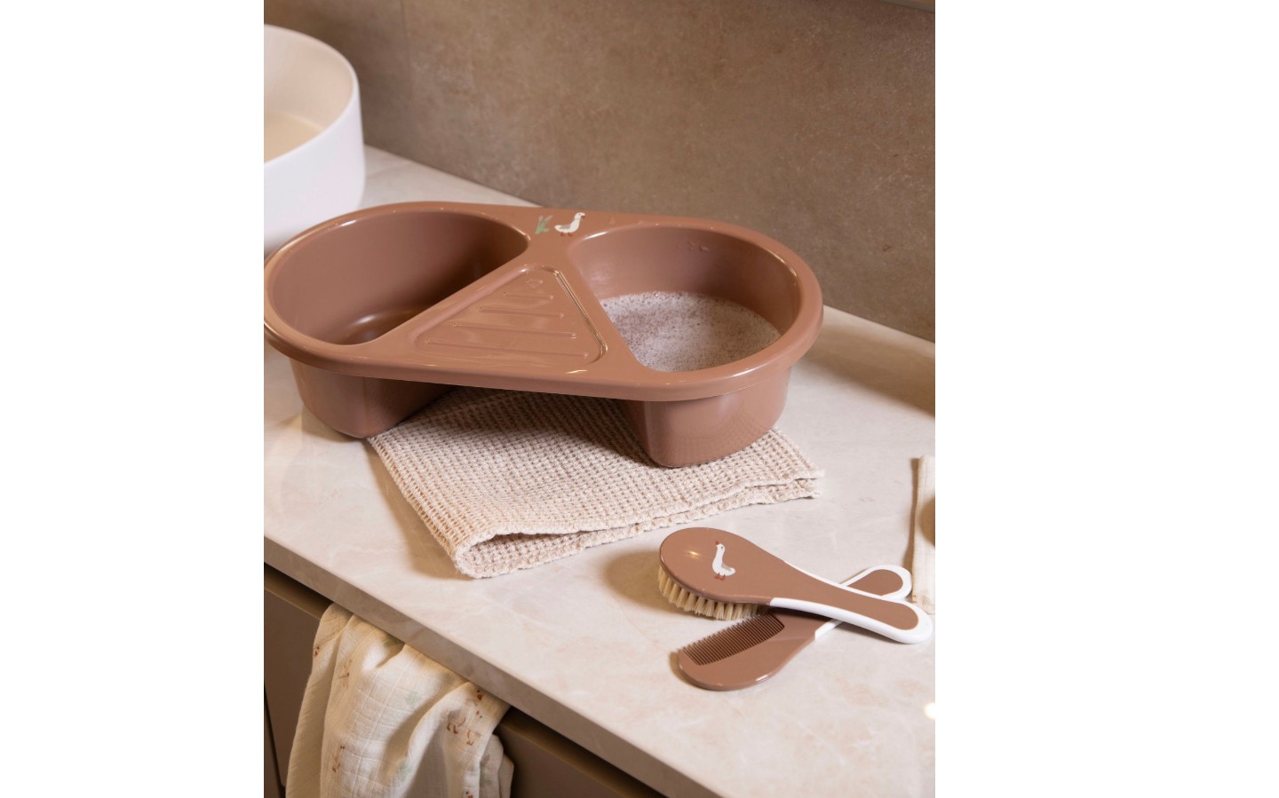 De bébé-jou waskom kan je gebruiken om je kindje in te zepen voordat het in bad gaat of wanneer je, je kleintje wast op de commode. Hoe werkt het? Het ene bakje vul je met schoon water en in het andere bakje spoel je het washandje uit. Ideaal om je kleintje even snel op te frissen.